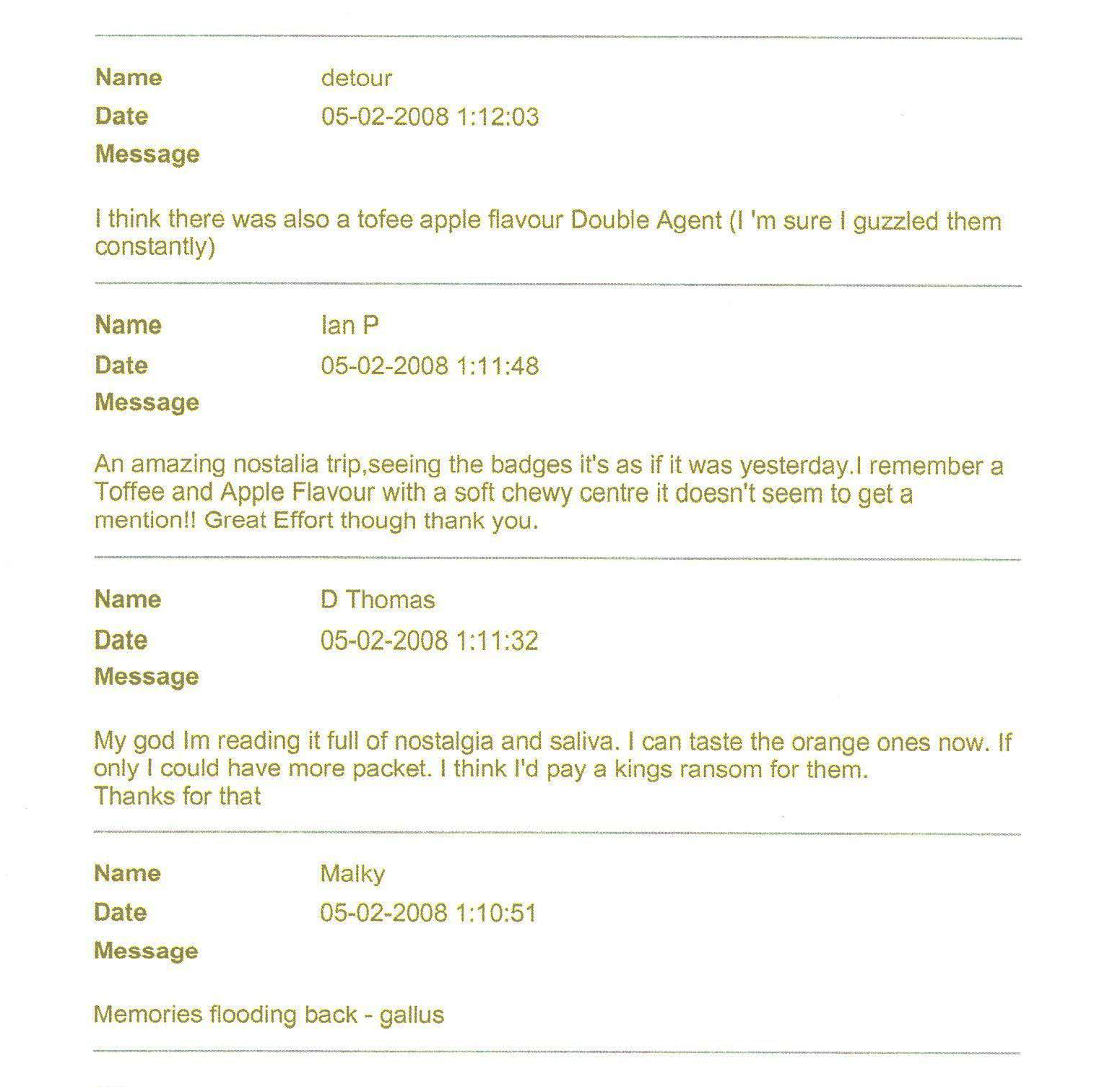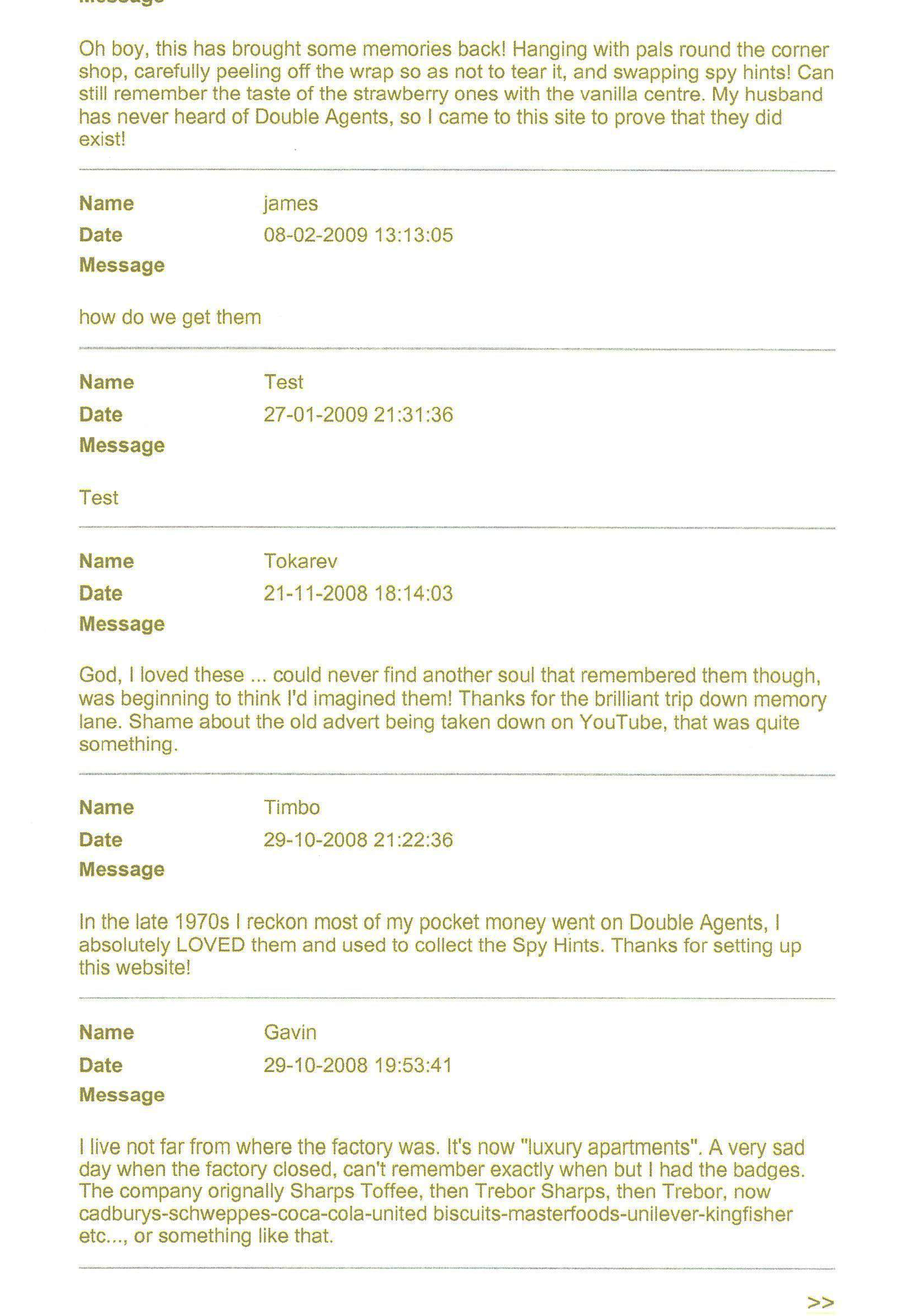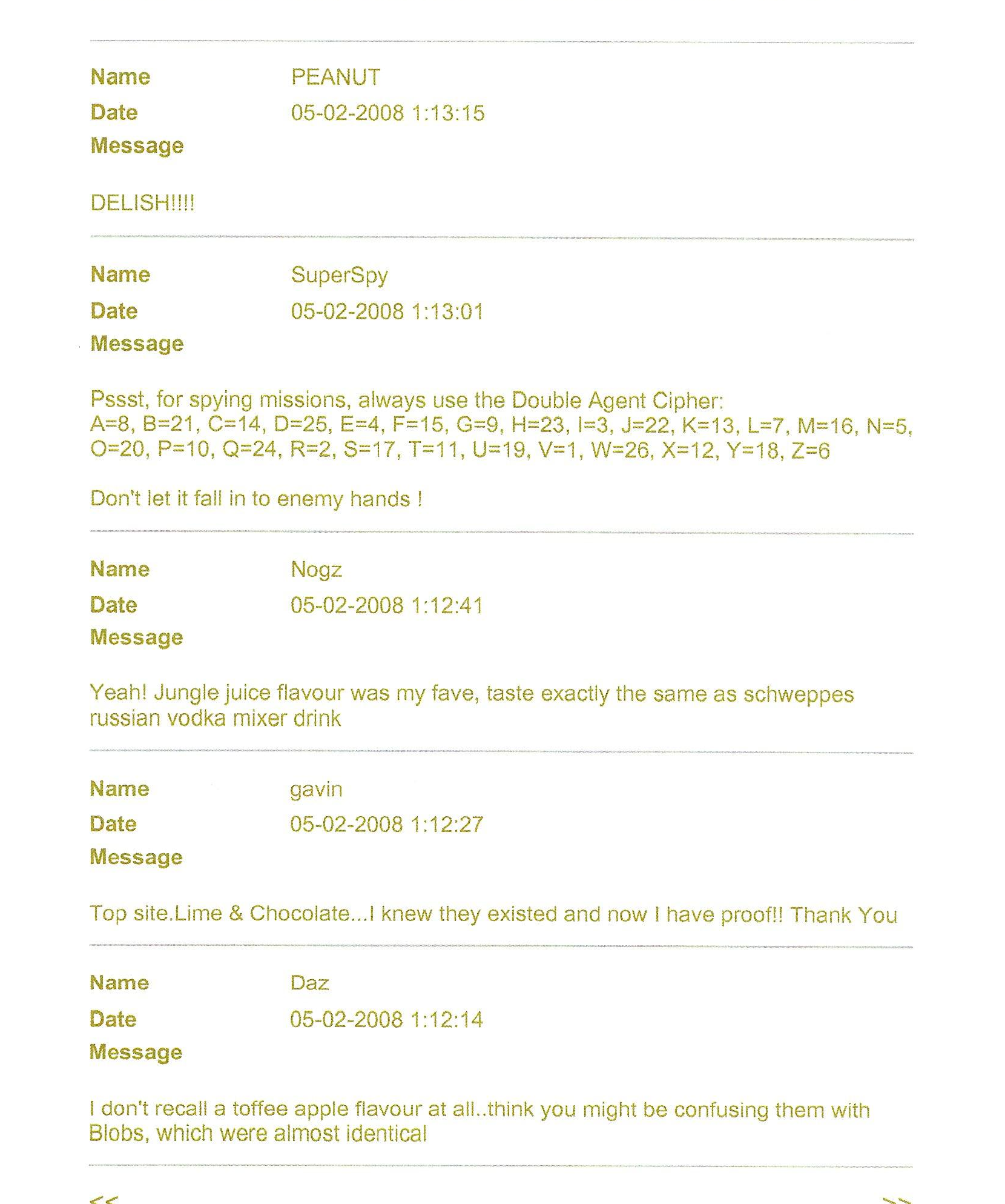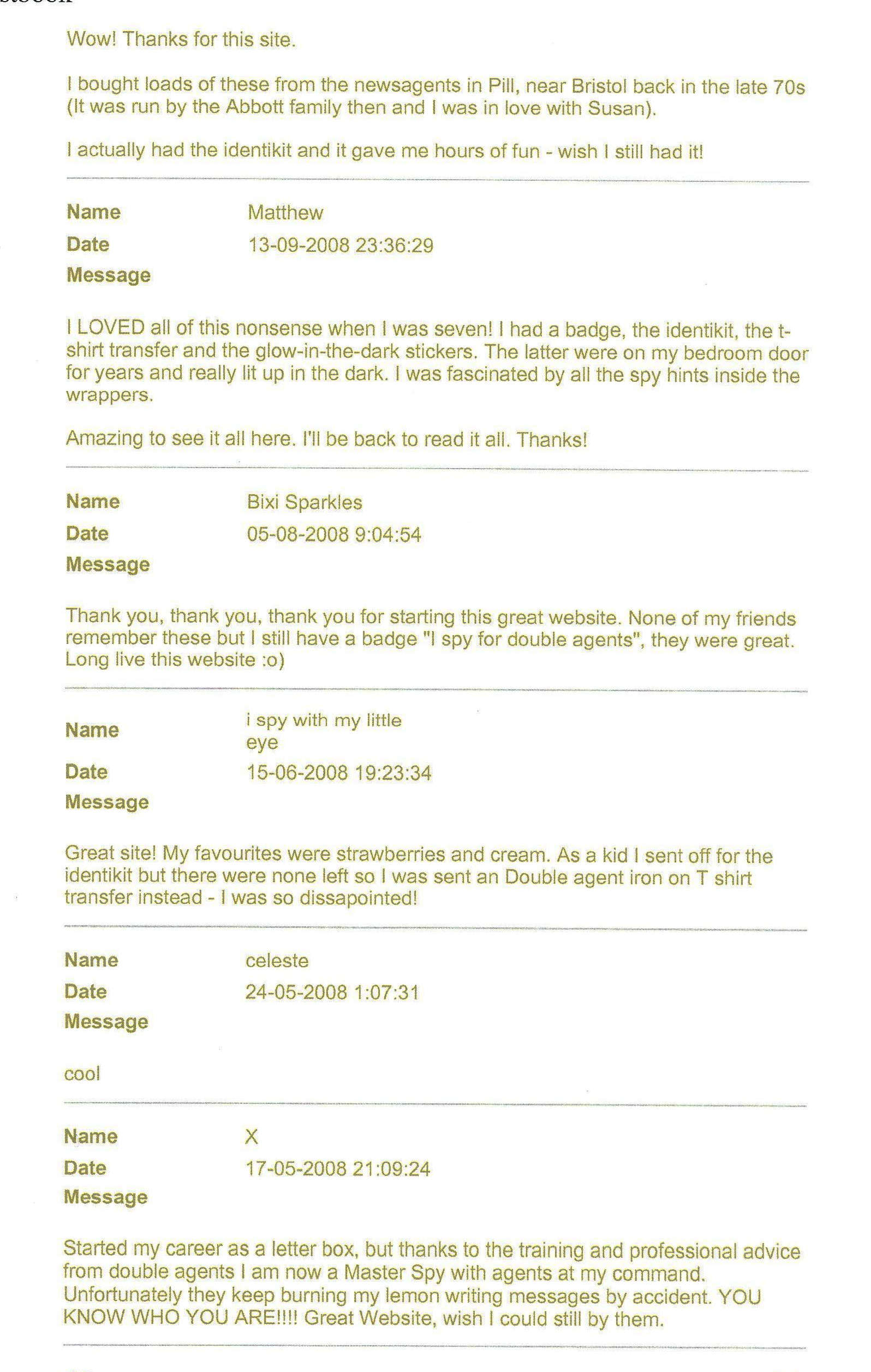 FLAVOURS SPY HINTS (SERIES 1) SPY HINTS (SERIES 2) Fingerprint Kit IdentiKit Revolver Training ManuaL Glow-in-the-dark stickers BadGeS & Stickers TV Commerical SECRET CODE OTHER ITEMS & INFO GUEST BOOK LINKS |