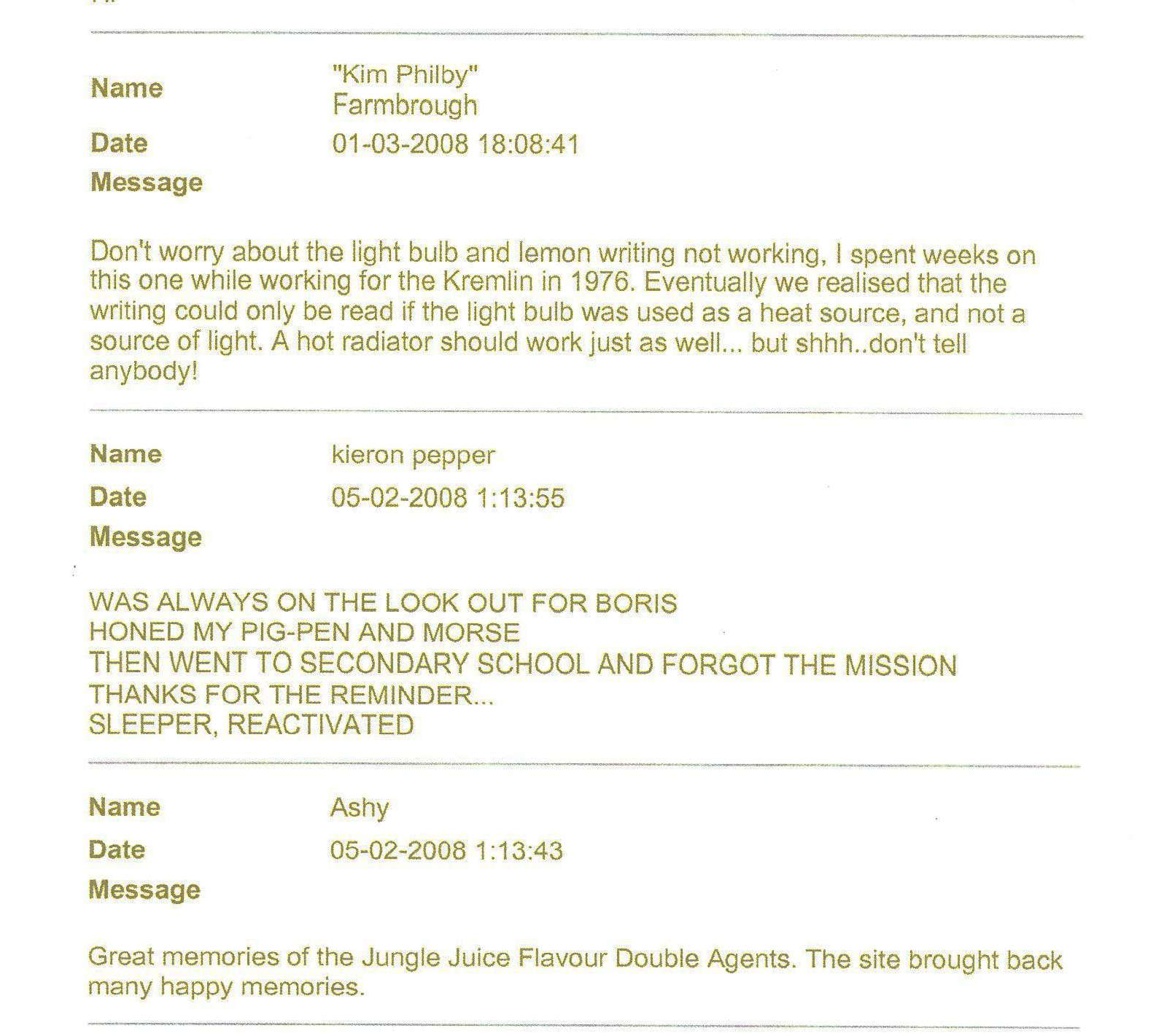 FLAVOURS SPY HINTS (SERIES 1) SPY HINTS (SERIES 2) Fingerprint Kit IdentiKit Revolver Training ManuaL Glow-in-the-dark stickers BadGeS & Stickers TV Commerical SECRET CODE OTHER ITEMS & INFO GUEST BOOK LINKS |